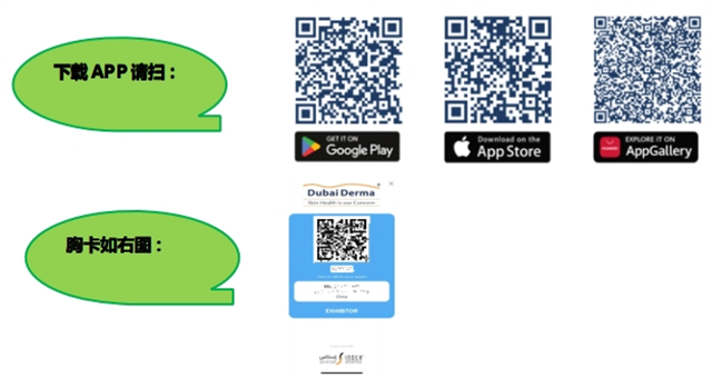 展商證領?。?/strong>所有參展商都需要開展之前在網上預先注冊,再從手機下載 APP 導出(請搜索 DUBAI DERMA),截圖胸卡存在手機相冊,進館掃胸卡上的二維碼進入。