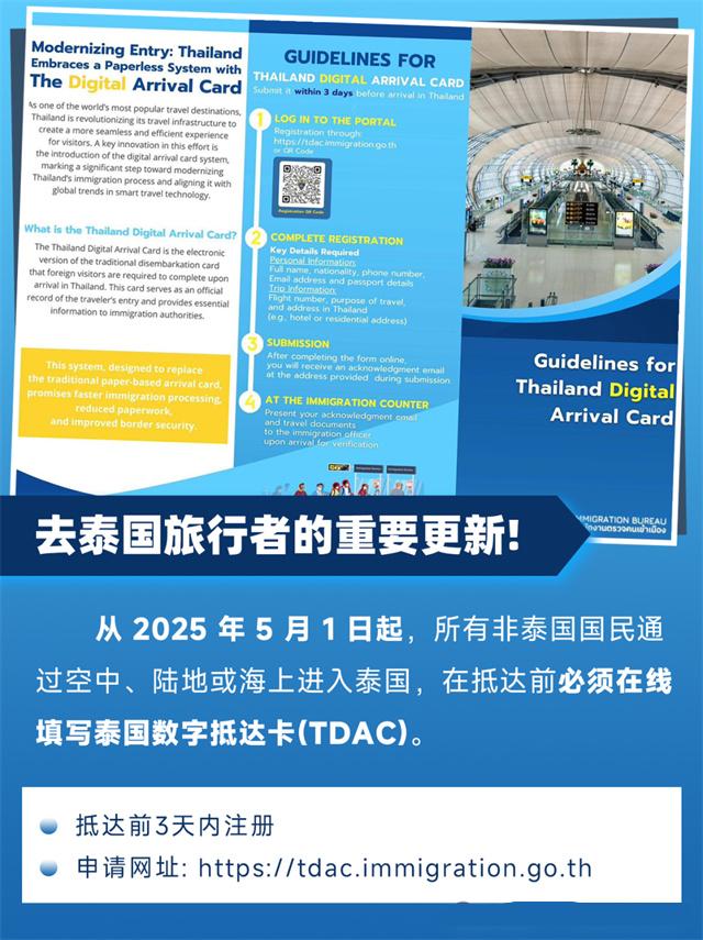 從 2025 年 5 月 1 日起,所有非泰國國民通過國際航班、陸路或海路進入泰國,在抵達前必須在線填寫泰國數字入境卡(TDAC)。