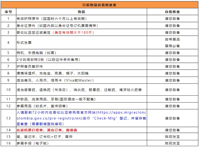 特別提醒:一定要隨身攜帶有效護照原件(護照有效期須在回國日期后至少有六個月有效期)、有效哥倫比亞簽證或美國簽證(美簽有效期大于180天)、機票行程單(必須有確認的離開哥倫比亞的航段)、酒店訂單、邀請函、“Check-Mig”登記表入境哥倫比亞。
