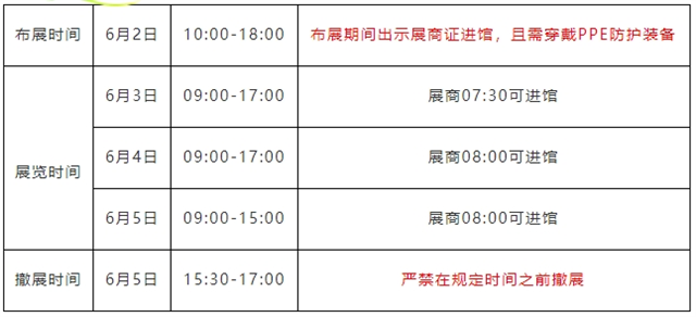 一、請于2025年6月2日(星期一)18:00 前完成展臺裝飾及展品布展;出于安全考慮,參展商入館時需登記并出示展商證;在布展和撤展期間,至少需要適當?shù)膫€人防護裝備、防護背心和安全靴才能進入大廳。如果未穿戴正確的 PPE,且未按要求顯示有效證件,則將拒絕進入。