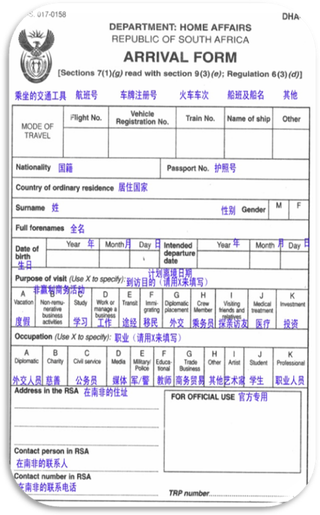 南非入境卡:南非入境卡將在飛機即將到達南非的時候,在飛機上發放,請按要求填寫。(見下頁表格)
