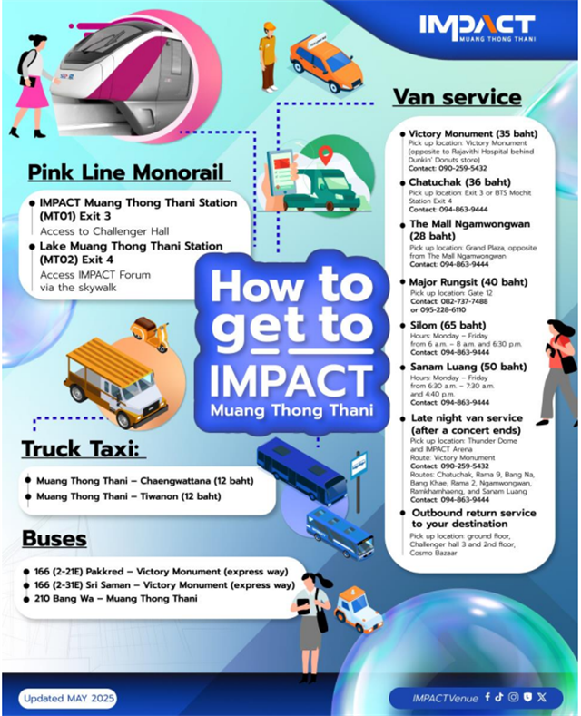 *新粉線(xiàn):•在Si Rat車(chē)站(PK09)轉(zhuǎn)乘Impact Spur線(xiàn),在Impact Muang Thong Thani站(MT01)下車(chē)。從Impact Muang Thong Thani站3號(hào)出口出站后,前往Challenger大廈或Impact Arena,步行至Impact Exhibition Centre。